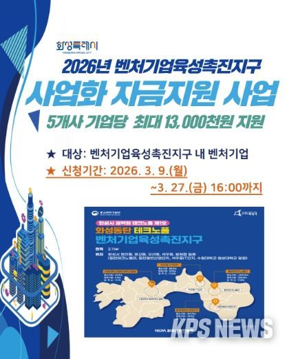 KPSNEWS 김채경 기자 | 화성특례시와 화성산업진흥원(원장 전병선)은 화성동탄테크노폴 벤처기업육성촉진지구 내의 벤처기업의 성장을 지원하기 위해‘2026년 벤처기업육성촉진지구 사업화 자금지원 사업’ 참여기업을 오는 3월 27일까지 모집한다.
