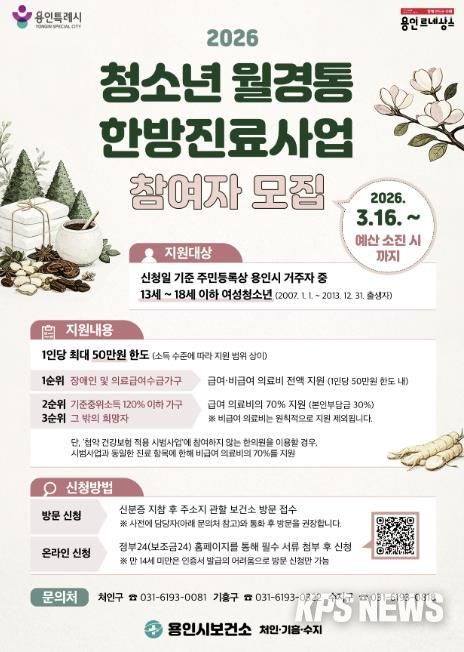 KPSNEWS 김채경 기자 | 용인특례시는 청소년들의 건강한 성장을 돕기 위해 ‘청소년 월경통 한방진료 지원사업’을 실시한다고 10일 밝혔다.