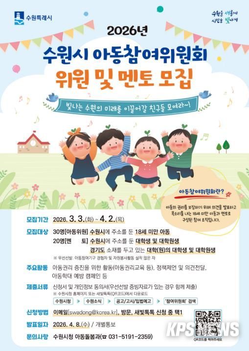 KPSNEWS 김채경 기자 | 수원특례시는 ‘2026년 아동참여위원회’에서 활동할 아동 위원과 대학(원)생 멘토를 모집한다.