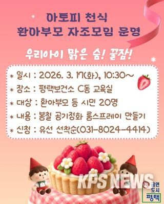 KPSNEWS 김채경 기자 | 평택시는 알레르기 질환으로부터 안전한 지역사회 환경을 조성하기 위해 오는 17일 오전 10시 30분, 평택보건소(C동) 교육실에서 ‘아토피·천식 환아 부모 자조모임’을 운영한다고 밝혔다.
