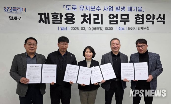 KPSNEWS 김채경 기자 | 화성특례시 만세구가 도로 유지보수 과정에서 발생하는 폐기물을 효율적으로 처리하고 자원 재활용을 확대하기 위해 관내 아스콘 생산 업체와 ‘폐아스콘 재활용 처리 협약’을 체결했다.