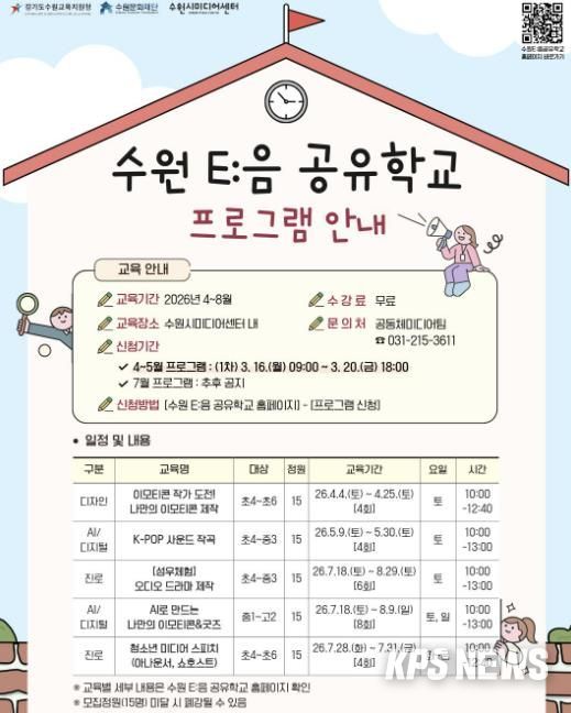 수원시미디어센터는 ‘2026년 수원 E:음 공유학교’ 지역맞춤형 기관 연계 프로그램 운영 기관으로 선정되어, 오는 4월부터 디자인, 사운드, 스피치 등 다채로운 미디어 교육을 본격 가동한다.