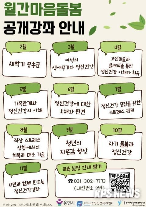 KPSNEWS 김채경 기자 | 용인특례시는 용인시정신건강복지센터 주관으로 시민 정신건강 증진을 위한 ‘월간 마음돌봄 공개강좌’ 3월 과정을 19일 용인시정신건강복지센터 영덕분소에서 진행한다고 13일 밝혔다.