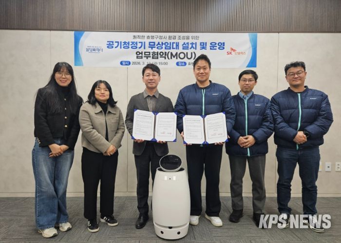 KPSNEWS 김채경 기자 | 화성특례시 효행구가 13일 SK인텔릭스와 ‘공기청정기 무상임대 설치 및 운영 업무협약(MOU)’을 체결하고 청사 내 실내 공기질 개선을 위한 인공지능(AI) 자율주행 공기청정기를 설치했다. 이번 협약은 지난 2월 개청한 효행구청사가 시민들에게 미세먼지 걱정 없는 쾌적한 행정 공간을 제공하기 위해 마련됐다.