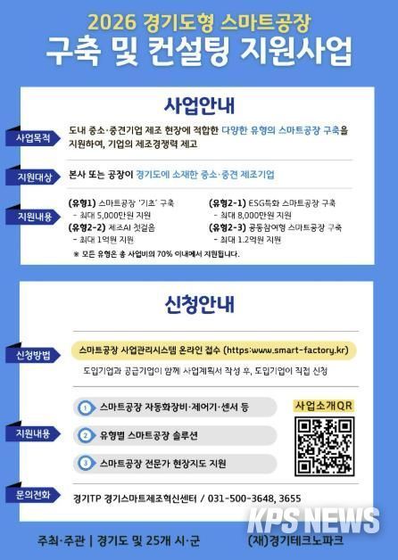 KPSNEWS 김채경 기자 | 수원특례시가 경기도와 함께 ‘2026년 경기도형 스마트공장 구축 및 컨설팅 지원사업’ 참여 기업을 공모한다. 경기도 22개 시군 소재 중소제조기업을 지원하는데, 수원시 기업은 4개사를 선정할 예정이다.