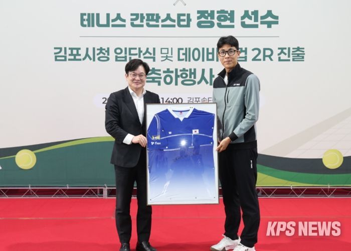 KPSNEWS 김채경 기자 | 김포시는 17일 솔터실내테니스장에서 대한민국 테니스 스타 정현 선수의 김포시청 직장운동경기부 테니스팀 입단을 기념하고, 데이비스컵 2라운드 진출을 축하하는 행사를 개최했다.