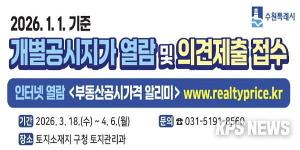 KPSNEWS 김채경 기자 | 수원시 영통구는 3월 18일부터 4월 8일까지 20일간 2026년 1월 1일 기준 개별공시지가에 대한 열람을 실시하고 토지소유자 및 이해관계인의 의견을 접수한다.