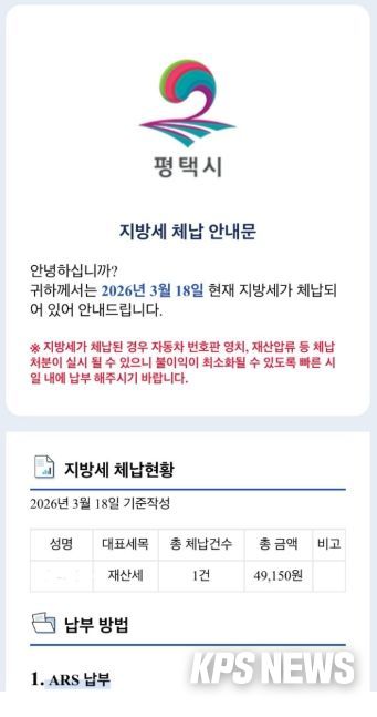 KPSNEWS 김채경 기자 | 평택시는 ‘모바일 전자고지 시스템’을 활용해 지방세 체납자 1만7천여 명을 대상으로 오는 23일과 24일 이틀 동안 전자문서 형태의 체납안내문을 발송할 예정이다.