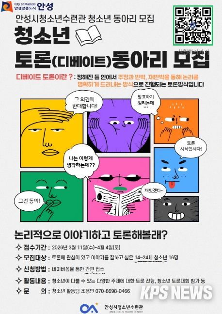 KPSNEWS 김채경 기자 | 안성시청소년수련관은 청소년들의 논리적 사고력 증진과 올바른 의사소통 문화 정착을 위해 ‘청소년 토론(디베이트) 동아리’ 참가자를 모집한다고 밝혔다.