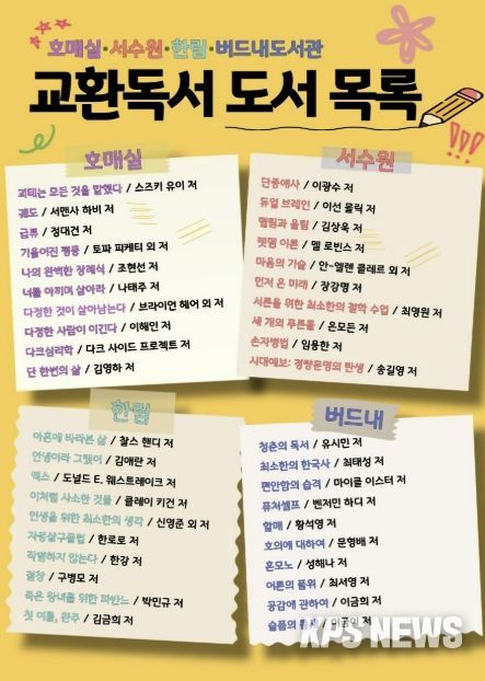 KPSNEWS 김채경 기자 | 수원시 권선구 4개 공공도서관(호매실·서수원·한림·버드내도서관)이 책을 매개로 서로의 생각과 감상을 나누는 ‘교환독서 클럽’ 참여팀을 모집한다.