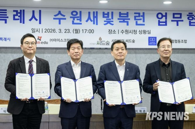 수원시와 ㈜아이스크림에듀, (사)씨드(Seed)숲, 수원시서점협동조합은 23일 시청 상황실에서 ‘수원새빛북런(Book Learn) 업무협약’을 체결하고, 협력을 약속했다.