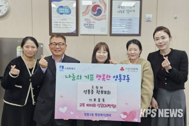 김인태 영통3동장은 “지역사회를 위해 따뜻한 나눔을 실천해주신 영통중 학부모회에 깊이 감사드리며, 전달받은 성금은 도움이 필요한 이웃에게 소중히 전달하겠다”고 감사의 뜻을 밝혔다.