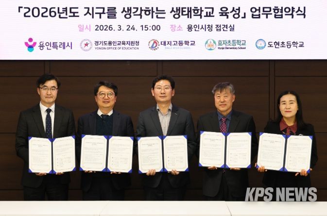 KPSNEWS 김채경 기자 | 용인특례시는 24일 시청 접견실에서 용인교육지원청을 비롯해 3개 학교와 ‘지구를 생각하는 생태학교 육성사업’을 위한 협약을 맺었다.