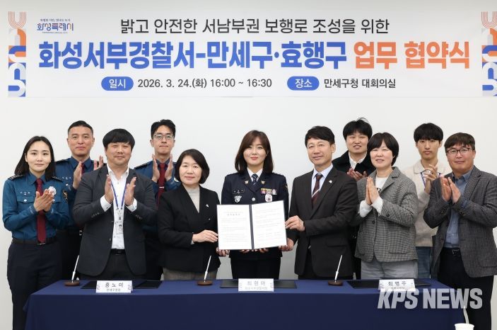 KPSNEWS 김채경 기자 | 화성특례시 만세구는 24일 만세구청 대회의실에서 화성서부경찰서, 효행구청과 함께 ‘밝고 안전한 서남부권 보행로 조성을 위한 업무협약(MOU)’을 체결했다고 밝혔다.
