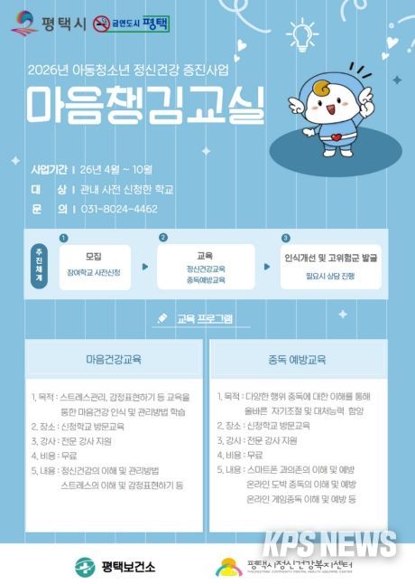 KPSNEWS 김채경 기자 | 평택시는 스쿨케어 사업의 일환으로 관내 학교 학생들을 대상으로 『마음챙김교실』을 운영한다고 밝혔다. 이번 프로그램은 학생들이 교육을 통해 정신건강을 올바르게 인식하고 스스로 관리할 수 있도록 지원함으로써 마음 건강 증진을 도모하는 데 목적이 있다.