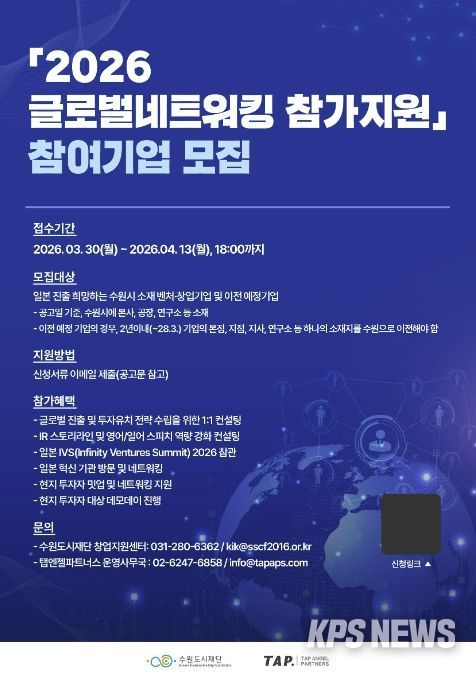 KPSNEWS 김채경 기자 | 수원특례시가 ‘2026 글로벌네트워킹 참가지원’에 참여할 벤처·창업 기업 7개사를 3월 30일부터 4월 13일까지 모집한다.