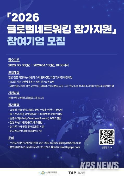 KPSNEWS 김채경 기자 | 수원특례시가 ‘2026 글로벌네트워킹 참가지원’에 참여할 벤처·창업 기업 7개사를 3월 30일부터 4월 13일까지 모집한다.
