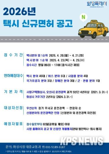 KPSNEWS 김채경 기자 | 화성특례시가 시민들의 교통 불편을 해소하고 택시 공급을 확대하기 위해 개인택시 운송 사업 신규 면허 63대를 발급한다. 시는 지난 24일 고시된 경기도 택시 총량 심의 결과에 따라 제5차 택시총량제 증차 물량인 69대를 확보했으며, 이를 2026년 내 모두 공급할 계획이다.