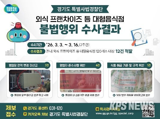 KPSNEWS 김채경 기자 | 경기도 특별사법경찰단은 지난 3월 3일부터 16일까지 도내 외식 프랜차이즈 등 대형음식점 120개소를 대상으로 집중 수사를 실시한 결과 영업장 면적 변경 미신고 및 영업자 준수사항 위반 등 총 12건의 불법행위를 적발했다.