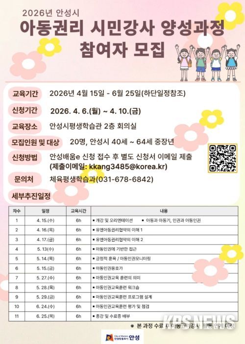 KPSNEWS 김채경 기자 | 안성시는 아동친화도시로서 아동권리 인식 확산과 시민강사 양성을 위해 '아동권리 시민강사 양성과정' 참여자를 모집한다.