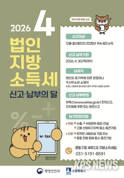 KPSNEWS 김채경 기자 | 수원시 영통구는 4월 1일부터 30일까지 법인지방소득세 확정신고 기간을 맞아 관내 7,500여 개 법인과 세무대리인을 대상으로 신고 안내를 강화했다. 기한 내 원활한 신고·납부를 돕기 위해 대상 법인과 세무대리인에게 안내문도 발송했다.