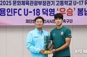 KPSNEWS 김채경 기자 | 용인특례시는 7일 오후 용인미르스타디움에 있는 용인시시민프로축구단 회의실에서 이상일 시장이 참석한 가운데 ‘2025 문화체육관광부장관기 고등학교 U-17 유스컵’ 우승컵 봉납식을 개최했다. 중국과의 동아시아축구연맹(EAFF) E1 챔피언십 1차전을 앞두고 열린 봉납식에서 이상일 시장은 전국대회 우승컵을 차지한 용인시축구센터 U18 덕영 선수들을 격려하고 대화의 시간을 마련해 축구 유망주들의 미래를 응원했다. 선수들은 앞으로 더욱 좋은 성적을 거둬 용인의 명예를 높이고, 대한민국 축구의 미래 주역으로서 책임을 다할 것을 약속했다. 이상일 시장은 “전국대회인 문화체육관광부장관기 고등학교 대회에서 우승을 차지한 것을 진심으로 축하한다. 최고의 결과를 거둬 용인을 빛낸 선수들과 감독, 코치진에게 감사하다”며 “선수들이 이 자리에 함께 한 용인시시민프로축구단 테크니컬 디렉터 이동국 선수처럼 대한민국을 대표하는 선수로 성장하기 바라고, 이번 대회 우승 경험이 그 소중한 밑거름이 될 것으로 생각한다”고 말했다. 이 시장은 “내년부터 K2리그에 참여하기 위해 창단을 진행 중인 용인시