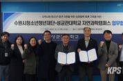KPSNEWS 김채경 기자 | 수원시청소년청년재단은 11일 성균관대학교 자연과학캠퍼스와 청소년ㆍ청년의 취‧창업 지원과 전인적 성장을 위한 업무협약(MOU)을 체결했다고 밝혔다. 이번 협약을 통해 양 기관은 △대학생 연계사업 활성화를 위한 지속적인 교류활동 추진 및 내실화 △청소년의 진로 탐색을 위한 멘토링 및 학과 탐방 기회 제공 △기타 상호 협력이 필요하다고 인정되는 분야에서의 협조 체계를 구축할 예정이다. 재단 관계자는 "이번 협약이 단순한 형식적 절차에 머무르지 않고 우리 청소년‧청년들에게 새로운 경험과 지속적인 성장의 기회를 제공하는 중요한 출발점이 되기를 희망한다"며, "협약의 성공적인 이행을 위해 상호 긴밀하게 협력해 나갈 것"이라고 밝혔다.