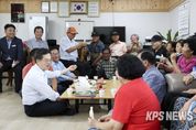 KPSNEWS 김채경 기자 | 김동연 지사가 탑승한 ‘달달버스’가 TOK 평택 포승공장 착공식을 마치고 달려간 곳은 포승읍 내기1리 무더위 쉼터. 1층 거실에 어르신 30여 명이 김동연 지사를 맞이했다. 김 지사가 쉼터에 들어서자, 포승읍장이 김 지사는 기다란 역 ㄱ자(') 형태의 소파 중앙에, 어르신들은 소파 앞 바닥에 앉길 권했다. 이 경우 소파 위에서 어르신들을 내려다보며 대화해야 한다. 김동연 지사가 황급히 손사래를 쳤다. “아니에요. 어르신들 무릎도 안 좋으신데, 어르신들이 소파 위에 앉으시는게 편하세요.” 읍장이 “그러면 말씀 나누기가 멀어서...”라고 머뭇거리자 김 지사가 말했다. “제가 가까이 다가가 앉으면 되죠.” 김 지사는 쉼터 내 구석에 멀찍이 있던 테이블을 직접 양손으로 끌어 소파 앞으로 옮겨놓았다. 그리곤 테이블 주변 바닥에 철퍼덕 주저 앉았다. 그제야 어르신들이 옹기종기 소파에 둘러앉았다. 그렇게 김 지사는 어르신들을 올려다보면서 눈높이를 맞추고 대화를 시작했다. 이날 김 지사의 강행군을 거의 모두 함께한 정장선 평택시장이 “오늘 제일 먼저 민생 시