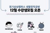KPSNEWS 김채경 기자 | 경기문화재단 경기상상캠퍼스(대표이사 유정주)는 겨울 시즌 생활창작공방 프로그램 참여자를 오는 17일부터 모집한다. 생활창작공방은 경기상상캠퍼스 생생1990에 위치한 경기생활문화센터 교육 커뮤니티 공간으로, 도민이 일상 속에서 다양한 창작 활동을 경험할 수 있도록 재단공방, 어린이창작공방, 드로잉실, 취미공방, 직물공방, 커피공방, 사진촬영실까지 총 7개의 특화 공간을 운영하고 있다. 11월에는 총 11개의 프로그램이 구성돼 있으며, 주요 프로그램으로는 △Set in wool(울조끼와 가방 만들기), △오롯이 나에게 집중하는 시간: 4주 터프팅 힐링 프로젝트, △내 생애 첫 그림- 알기 쉬운 민화'일월오봉도', △그림책 마음 놀이터 등이 있다. 12월에는 △오일파스텔로 만드는 2026년 달력 △우리들의 예술놀이터, △복을 담는 라탄 복조리 만들기, △복을 쓸어 담는 모시 빗자루 만들기, △커피의 감별과 추출 방법: 커핑까지 총 5개의 프로그램이 운영될 예정이며, 수강 신청은 11월 14일부터 각 프로그램 시작 4일 전까지 경기상상캠퍼스 누리집을 통해 가능하다. 경기상상캠