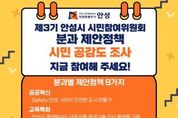 KPSNEWS 김채경 기자 | 안성시는 오는 18일 오후 6시까지 시민참여위원회 분과별 제안 정책에 대한 시민 의견을 수렴한다고 밝혔다. 이번 시민 의견 수렴은 시민참여위원회 정책 발표회를 앞두고 진행하는 사전심사로, 분과별 제안 정책에 대한 시민 공감도를 확인하여 추후 현장심사 결과와 함께 최종 우수 제안 정책을 선정하는 데 활용된다. 7개 분과로 구성된 안성시 시민참여위원회는 소속 위원의 다양한 경험과 지속적인 논의를 바탕으로 안성시 시정에 반영할 정책 연구 활동을 추진해 왔으며, 이달 정책 발표회를 통해 각 분과에서 도출한 정책을 제안하여 그간 활동의 결실을 맺을 예정이다. 정책 발표회를 통해 각 분과에서 제안할 정책 주제는 ▲Safety 안성, 시민이 안전한 도시 만들기(공공혁신분과) ▲안성시 평생학습도시에 따른 평생교육 강사 플랫폼 구축(교육특화분과) ▲안성시 한우산업 탄소중립 모니터링 시스템 구축(미래농업분과) ▲안성시민을 위한 태양광발전 5개년 계획(생태도시분과) ▲전통문화 예술인들을 위한 창작공간 확보(문화도시분과) ▲안성, 사랑 흔들바위 관광지 조성(문화도시분과) ▲더불어 이동하는 자유로운 안성